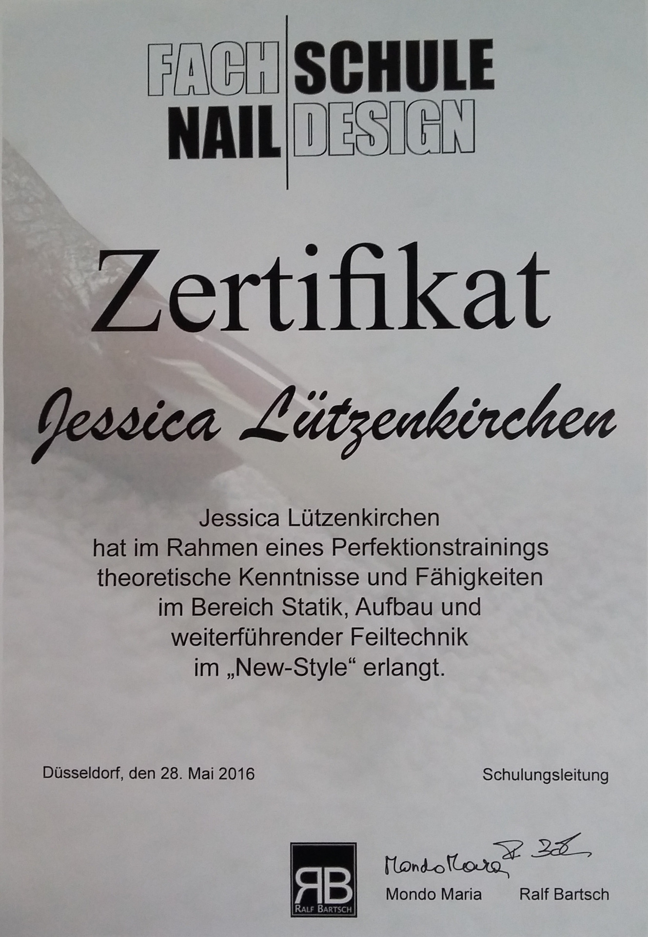 Ich besuchte im Juni 2014 eine Schulung zur Naildesignerin in Köln. Anschließend machte ich noch ein Praktikum von 6 Wochen in einem Nagelstudio um weitere Praxis zu sammeln und mein erlerntes zu vertiefen.